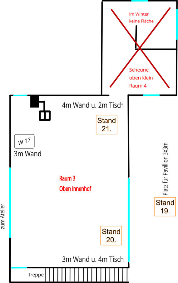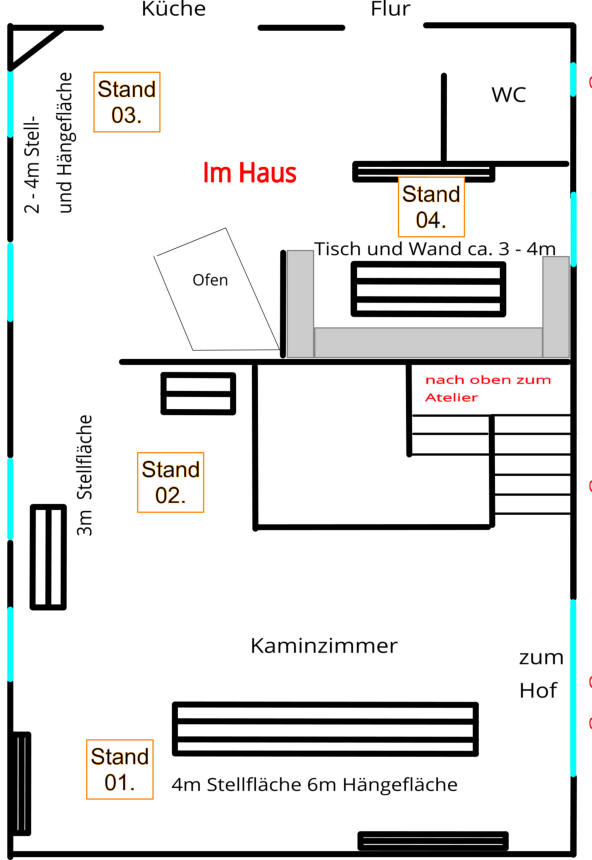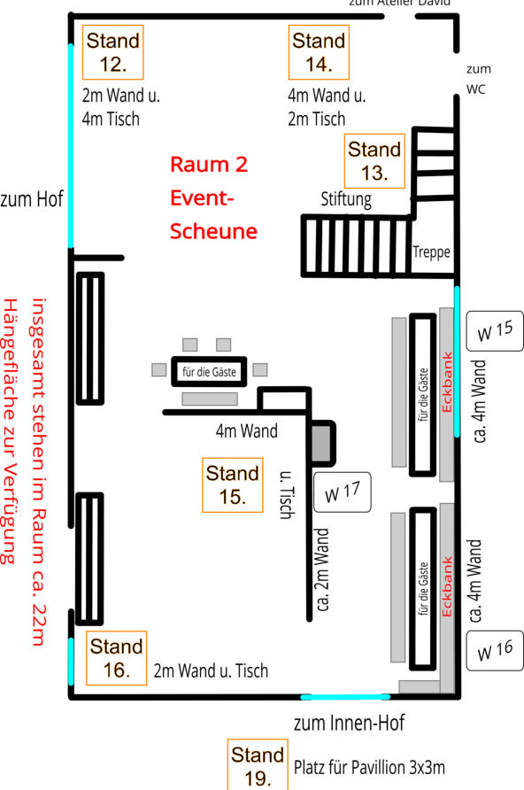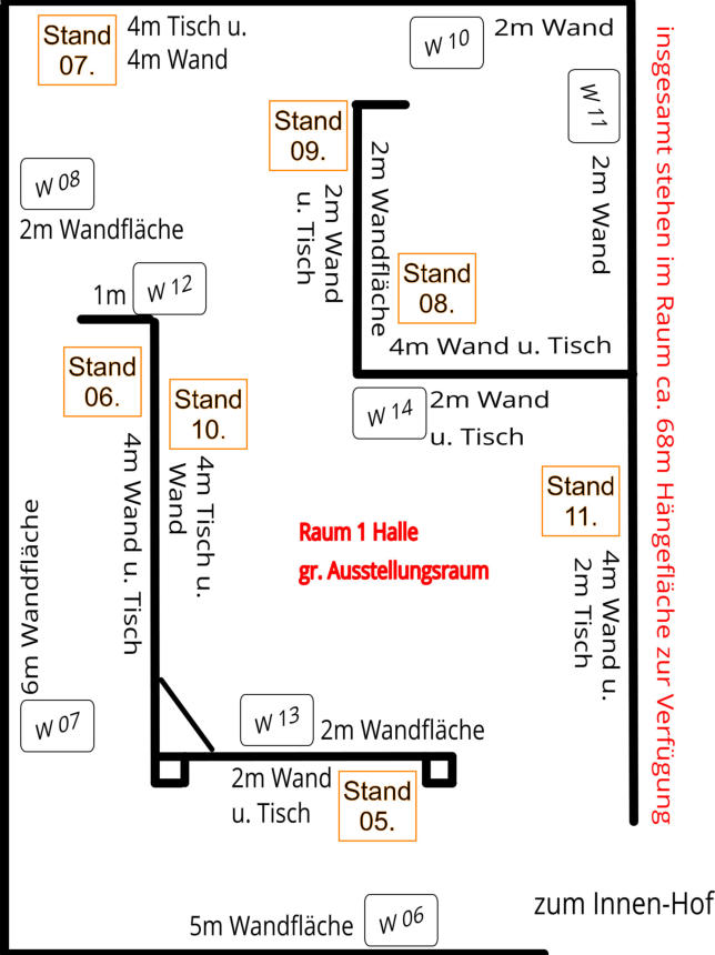 Kunsthandwerker Markt in der Werner Brand Kunststiftung 2025 								Stand 27.11.2024  Bewerbungs Richtlinien zum Kunsthandwerker Markt, am 15. und 16.11.2025 von 13:00 - 18:00 Uhr geöffnet.  Bitte senden Sie uns eine Kurzbeschreibung was Sie ausstellen möchten. Unser Markt ist offen für Kunsthandwerk in fast jeder Form von Bilder, Holz, Stahl, Schmuck, Keramik usw. Die Standgebühr für beide Tage beträgt pro 1/lfm 10 Euro für anfallende Unkosten,   natürlich dürfen Sie auch mehr geben.  Über eine Kuchenspende für unser Cafe´freuen wir uns. Bitte geben Sie uns Rückmeldung ob Sie einen Kuchen spenden möchten. Ansonsten ist der Markt für Aussteller und Besucher kostenfrei.   Den  Teilnehmern stehen Innenräume mit und ohne Wandflächen und Hoffläche „1x 3x3m Pavillion„ zur Aufstellung eines eigenen Pavillions  (nach Absprache) zur Verfügung.  In diesem Jahr steht auch der große Ausstellungsraum (Halle) für Aussteller zur Verfügung. Stellflächen für eigene Biertische, Tapeziertische oder ähnliches sind vorhanden. Eine Übersicht der Räume finden Sie weiter unten auf dieser Seite. Vergabe der Stellflächen in der Reihenfolge der Anfragen, Stellflächenwünsche sind nach Absprache möglich. Individuelle Stellplätze auf Anfrage. Für Bewerber stehen insgesamt 6 Biertische kostenfrei zur Verfügung.  Bitte teilen Sie uns bei Ihrer Bewerbung mit wie viele Tische Sie ausleihen möchten. Im Hof vorne und hinten gibt es die Möglichkeit des Aufbaus im Freien (sprechen Sie uns an).  Bewerbungs- und Einsendeschluß ist der 14.09.2025 24Uhr.  Bewerbung bitte per Mail an :  eMail: kunstmarkt@wernerbrand-kunststiftung.de  postalisch an:   Werner Brand Kunststiftung 76879 Hochstadt Hauptstraße 3 Bitte eine Kurzbeschreibung was Sie ausstellen möchten senden. Bitte geben Sie die uns bekannt wann Sie aufbauen möchten, Danke.  P.S. Für Diebstahl kann keine Haftung übernommen. Vielen Dank für Ihr Verständnis.  Bitte beachten! Der Aufbau des Marktes erfolgt : am Freitag den 14.11.2025 zwischen 15:00 Uhr und 20:00 und/oder  am Samstag den 15.11.2025 ab 10:30 Uhr.  Öffnung des Marktes Samstag und Sonntag von 13:00 - 19:00Uhr. Abbau am Sonntag ab 19:00 Uhr.